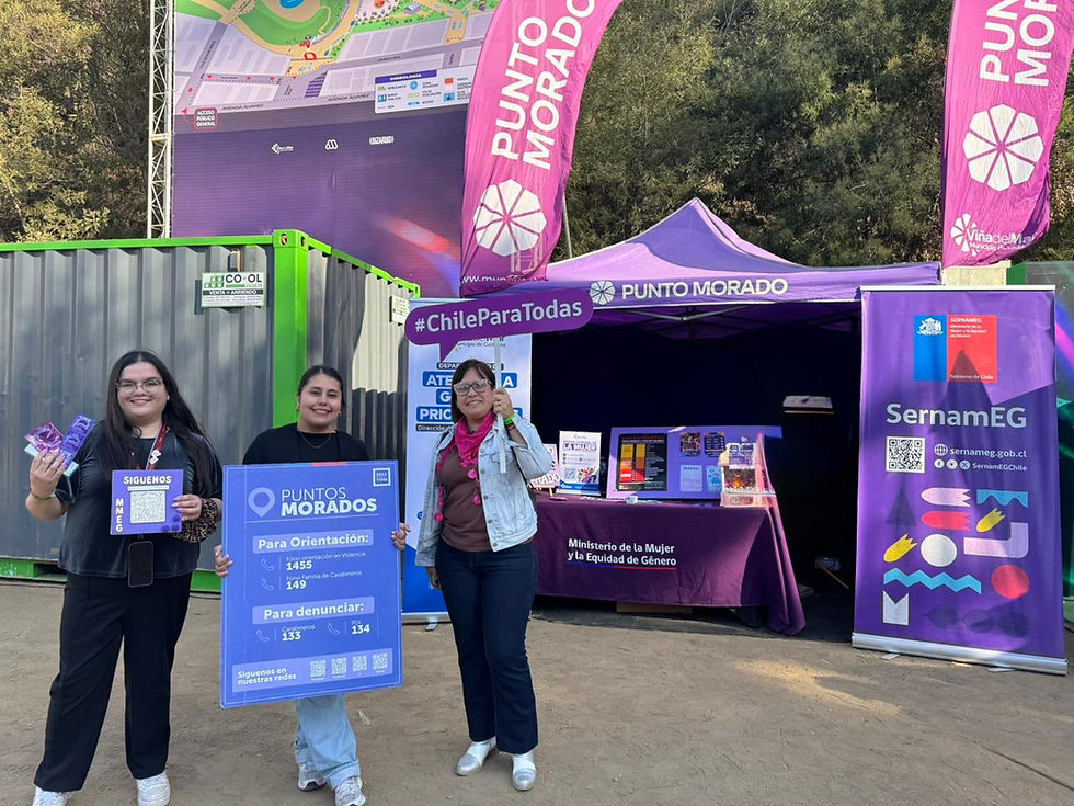 En una iniciativa que refuerza la presencia territorial del Estado en materia de igualdad de género, el Ministerio de la Mujer y la Equidad de Género y el Servicio Nacional de la Mujer y la Equidad de Género (SernamEG) se instalaron por segundo año consecutivo en el Festival Internacional de la Canción de Viña del Mar con su Punto Morado.
